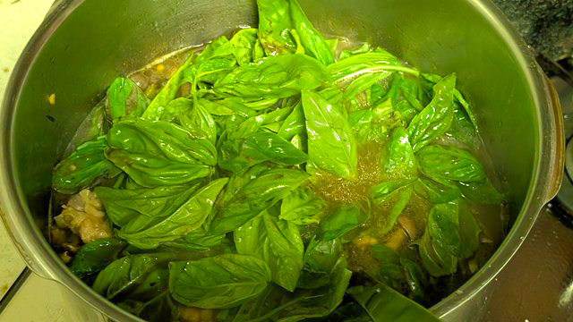 スープさえきっちり取っておけば、あとは塩気だけで旨くなります。ご飯と食べるのを考えて、勇気を持ってしっかり目に塩を入れましょう。なにせ、スープが1Lありますからね。バジルとの相性がいいナンプラーを忍ばせておくと、鶏だけではない旨みもプラスされて深みが出ますからおススメです。