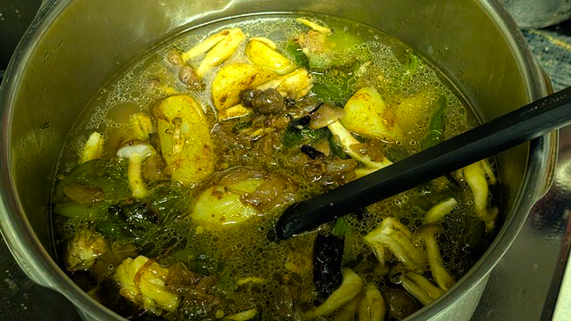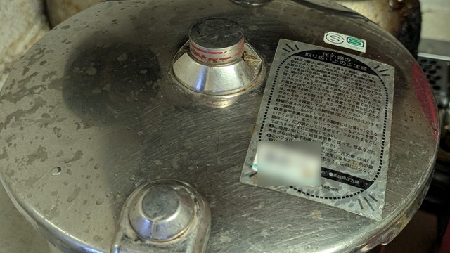 2.圧力鍋の中身が沸騰してきたら、フタをきっちり閉めて圧力をかけ、おもりが規定位置まで上がる、ないし振れ始めたら弱火にして10分煮る。その後、火を止めておもりが下がるまで放置する。