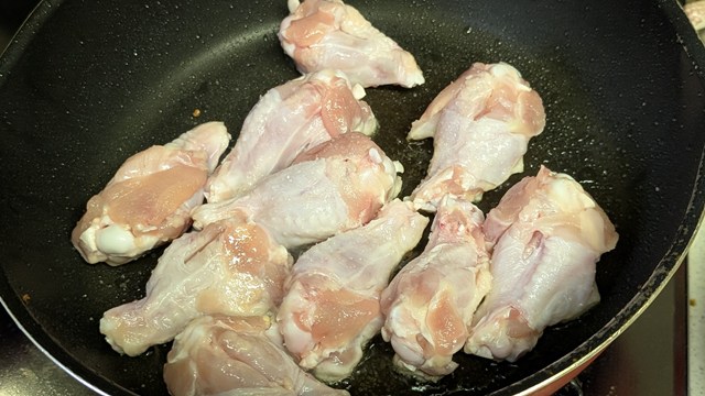 1.鶏手羽元には中の骨に沿って1本、切れ目を入れておく。出刃包丁があるのなら、骨に傷をつけておくとよりダシが出ますが、お任せします。