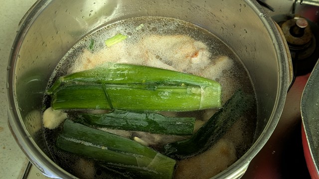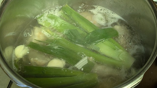 4.〈手羽元スープ〉からネギの青い部分を取り出し、3.を入れて合わせる。だいたい10分から15分煮込む。ナンプラーか醤油、塩で味付けをし、だいたい3回の味見で味を決めてしまう。最初に味の大枠を作り、2回目でぐっと完成に近づけ、3回目で微調整のイメージです。スープの量が多いので、結構塩の量は必要になると思います。