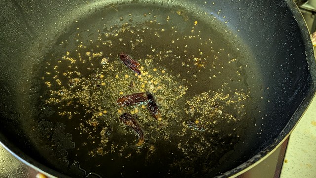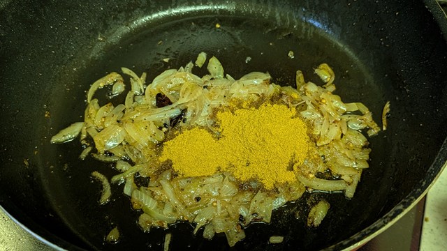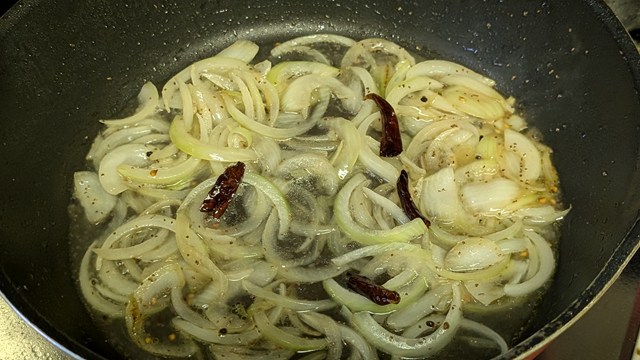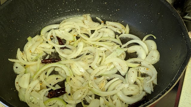 フライパンに残った油でカルダモンの粒、セロリシード、鷹の爪を熱し、香りが立ってきたら玉ねぎを入れて炒め始める。