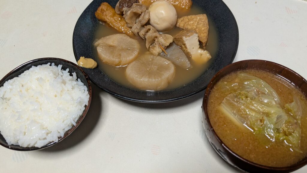 だから、おでんとご飯を合わせる際は、ご飯側に味をつけてしまおうということになって、おでんの茶飯(お茶で炊くほうではなく、おでん出汁ないしは醤油と出汁で炊くもの)になっていくのだろう。さて、この日の夕餉は昨夜のおでんの残りだが、一人だけの食卓なので、酒を呷る気にはなれず、ご飯を食べることにした。おでんとご飯だけでは、なんだかな……と思い、味噌汁をつくった。具はレタスだけの軽いもので、水と鰹節と味噌でさっと煮たものだ。