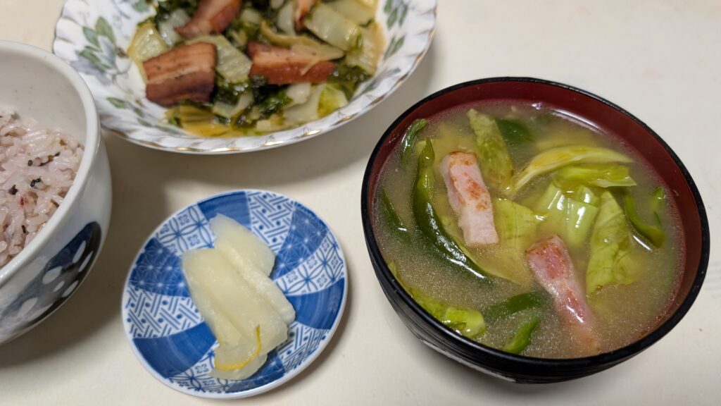 ベーコン・ピーマン・キャベツの炒め味噌汁