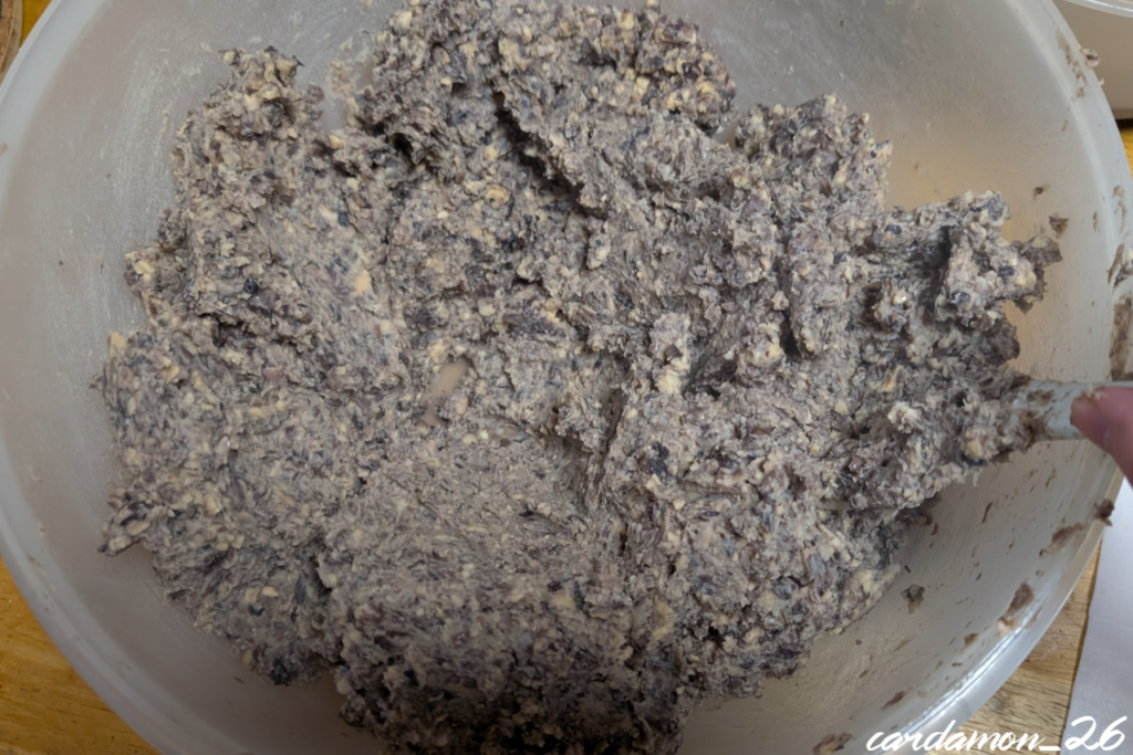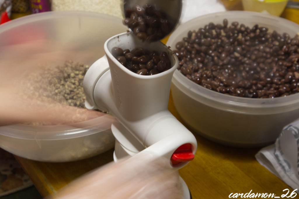 まず、前日から浸水しておいた黒豆を圧力鍋で炊く。このときの柔らかさの基準は、利き手でないほうの親指と薬指でも潰せるほどと叔母はいう。要するに、力が入らない指でも潰せるぐらいに柔らかく煮るのだ。そして、それをミンチ製造器(手動)でどんどんミンチ状にしていく。