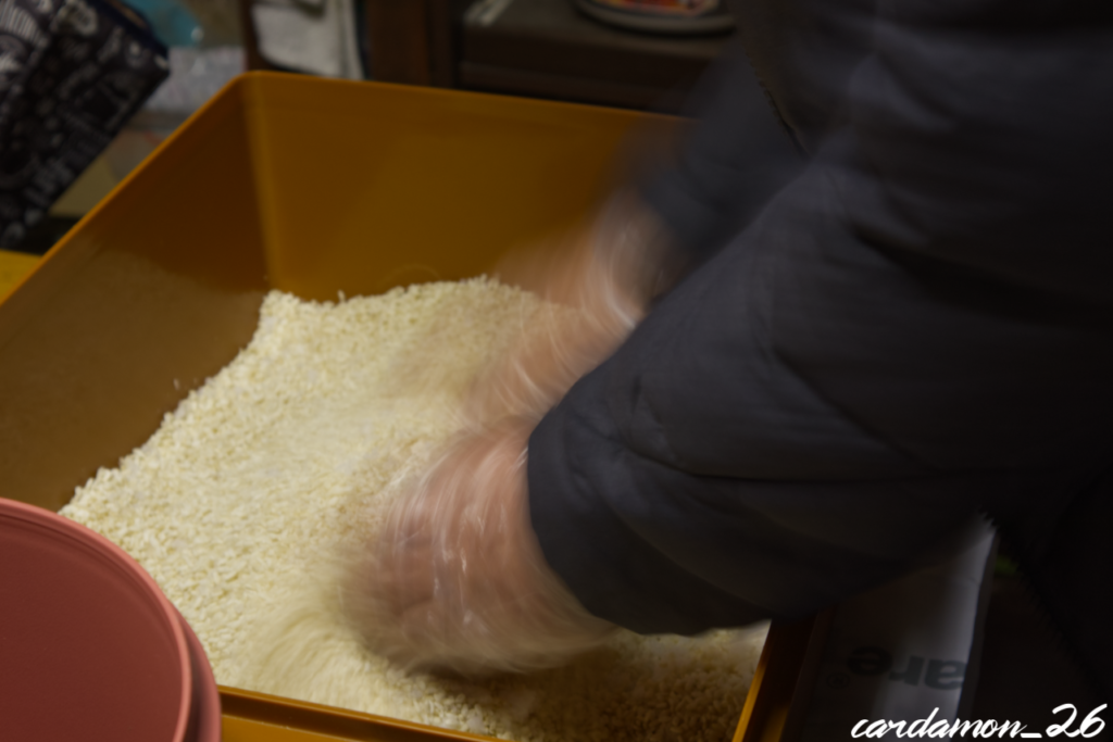 叔母曰く、「米麹を下に擦り付けるように」ミンチにした豆と米麹を混ぜ合わせる。これがなかなか重労働だが、結構面白い。