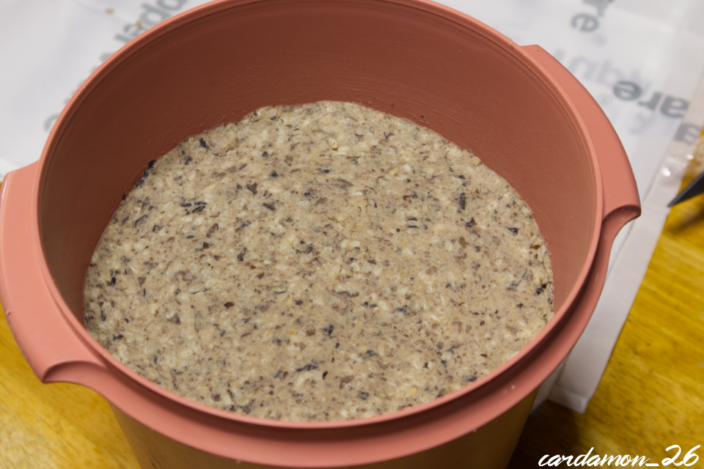 しっかり空気を抜くようにして容器に詰め込んだら、空気が入らないようにフタをする。味噌は嫌気性発酵なので、表面が空気に触れないように、なにか密閉できるフタをしないといけないのだが、そこで叔母が取り出したのが酒粕である。これを練って味噌の赤ちゃんの表面が見えないようにピッタリとフタをしてしまう。あとは容器のフタをして、冷暗所で半年ほど放置する。