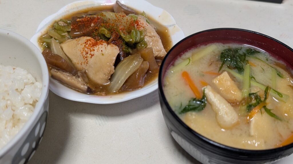 そして、大根の漬物に干し椎茸、白菜、鶏むね肉を加えて煮込み、最後に水溶き片栗粉でとめた、中華風の煮物へと転身させることに成功したのだ。それが、今回のおかずにもなっている。