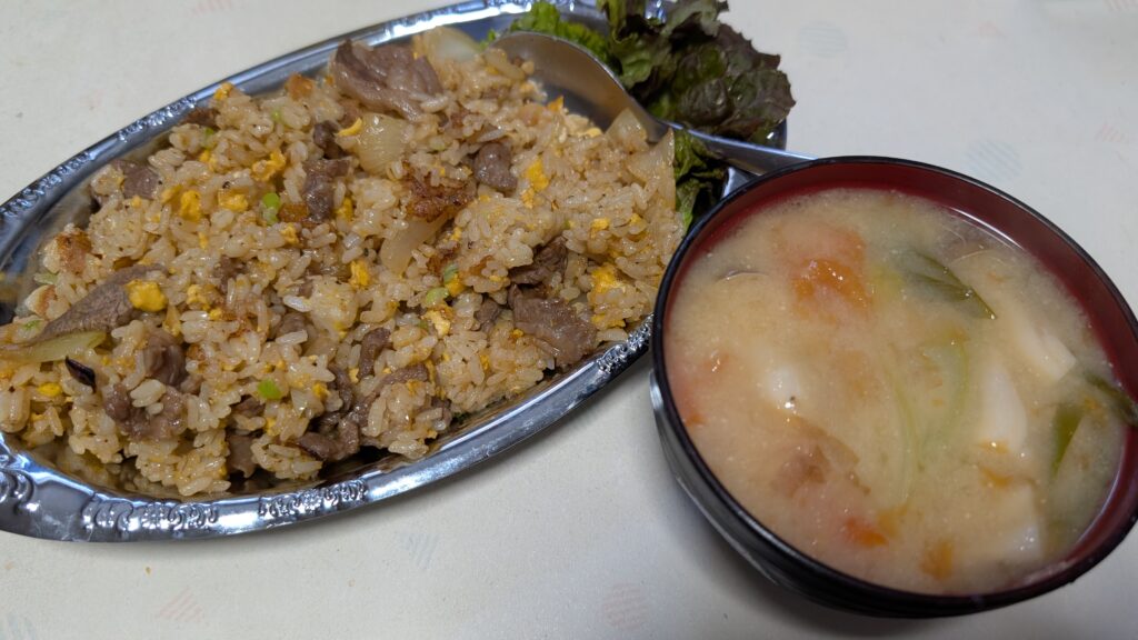 年に1度の家焼肉で余った肉を、余った焼き肉のタレと共にチャーハンに。合わせるのは目についた食材でサッと作れる味噌汁。ガツガツ一気にかきこんでしまいがちなチャーハンのスピードを緩める役割を持つ。