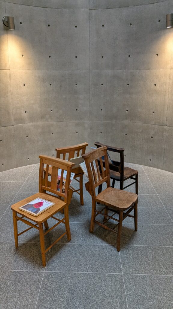 「こども本の森 神戸」の見どころはやはり、建物を縦に貫く、『休憩室』である。教会のような荘厳な空間には、天窓から光が降り注ぎ、またチャーチチェア、要するに教会に置かれているようなイスであるが、それがまた雰囲気を醸しだす。チャーチチェアの背もたれの奥には週替わりで一冊の本がそれぞれにイスに配置されており、その一冊との“出会い”も楽しむことができる。