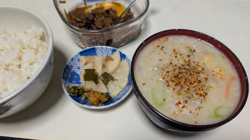 その会社を辞めて時間的余裕ができてもなお、コスパ・タイパ至上主義は抜けずに、25、6歳の頃まではせっかちに物事を進めていたような気がする。このブログに載せる写真の撮影後はそれを食べるのだが、カレーが多いというのもあって、ひたすらにスプーンでかき込んでいたような覚えがある。だがある時、もうどうしたって社会のレールには乗れないな、と気づいたときを境に、すっかりせっかちさが消え失せ、ゆったりと過ごすようになった。僕が一汁一菜をはじめるのはそれからである。一汁一菜が僕にゆとりをもたらしたというよりは、ゆったりと人生を構えるようになったから、一汁一菜をすんなりと受け入れられたといえる。