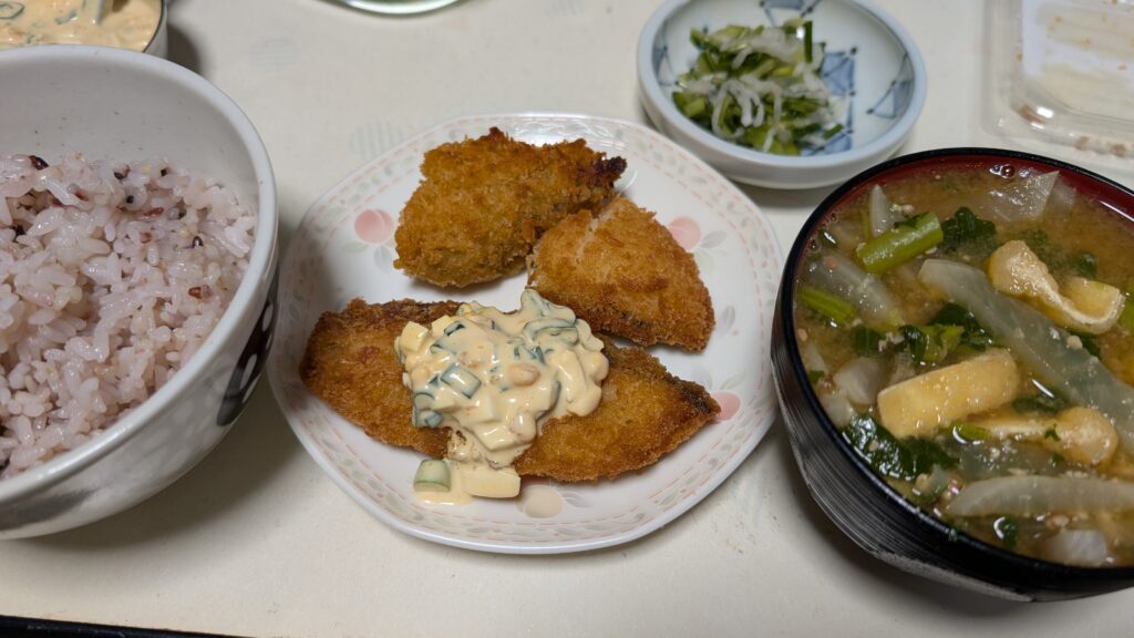 父の所望でフライがついた。かなり豪華になっている。フライはさすがにわざわざ家で揚げたものではなく、買ってきたものである。タルタルソースは3分クッキングで見かけた、和風タルタルソース。ゆで卵、細ネギ、醤油、からし、マヨネーズを適当に混ぜてつくる。