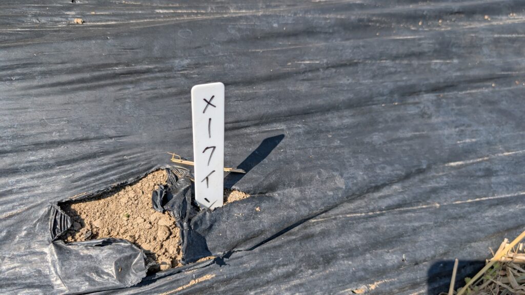 去年はマルチを用いた浅植えを試し、これがなかなかうまくいったので、マルチが張れるところでは同様に植えつつ、マルチを張っていない裸の土のほうは、深く溝を掘ってじゃがいもを埋めてきた。この溝掘りに三角ホーが大いに活躍した。いったい何役こなすんだ。
