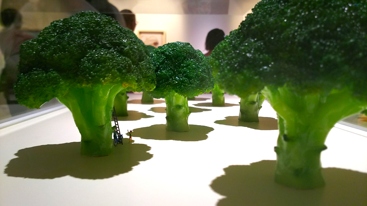 日本は「合わせる」のが得意技であろう。とんかつとカレーを合わせたし、あんことパンも合わせてみたし、カミとホトケまでをも合わせてきた。漢字に至っては唐土からやってきた読み方と、日本の読み方(訓読み)を合わせて使っていても平気なのである。さらには、合わせて見立てるのも得意であっただろう。庭のオブジェクトの配置から、歌に潜ませた寓意など、実景ではなく、想像の世界に遊ぶこともさかんにやってきたはずだ。ミニチュア写真家の田中達也はその最前線を走っている(サムネイルはその田中達也の展覧会に行った時の写真である)。